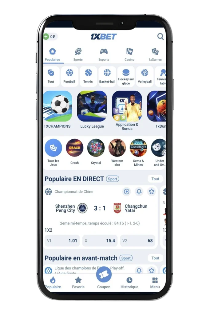- Large choix de jeux : Que vous soyez fan de paris sportifs, de casino, d’eSports ou de 1xGames, l’application répond à toutes vos envies avec une diversité impressionnante de jeux et de marchés.
